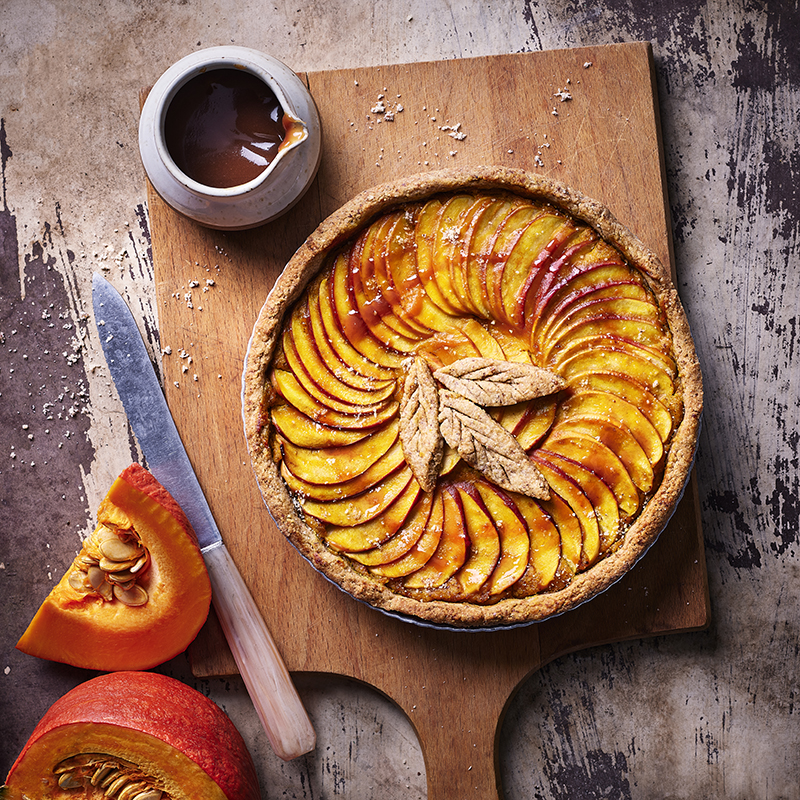 Tarte potimarron pommes caramel, pâte sablée à la noisette