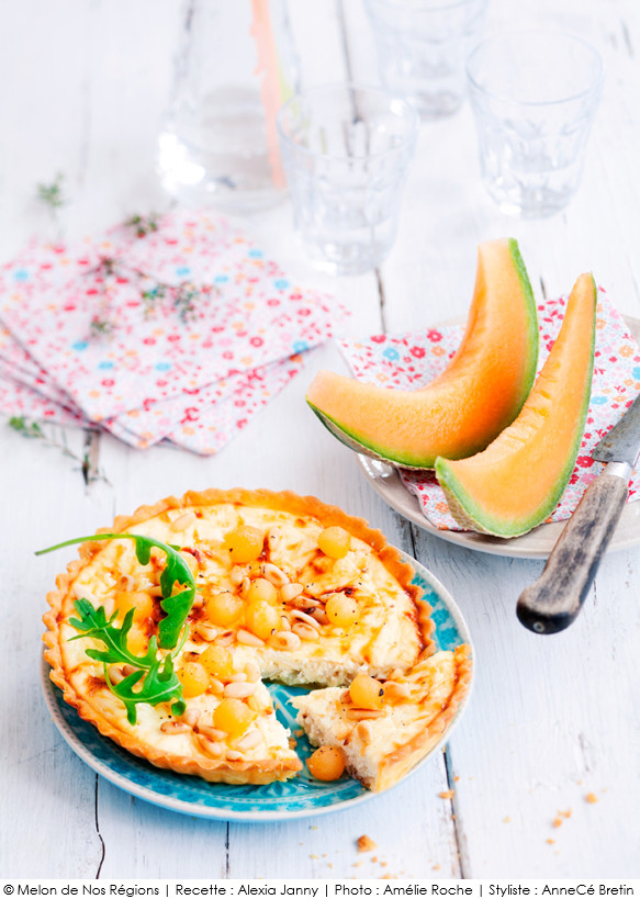 Tarte ricotta-chèvre et billes de Melon de nos Régions pignons de pin