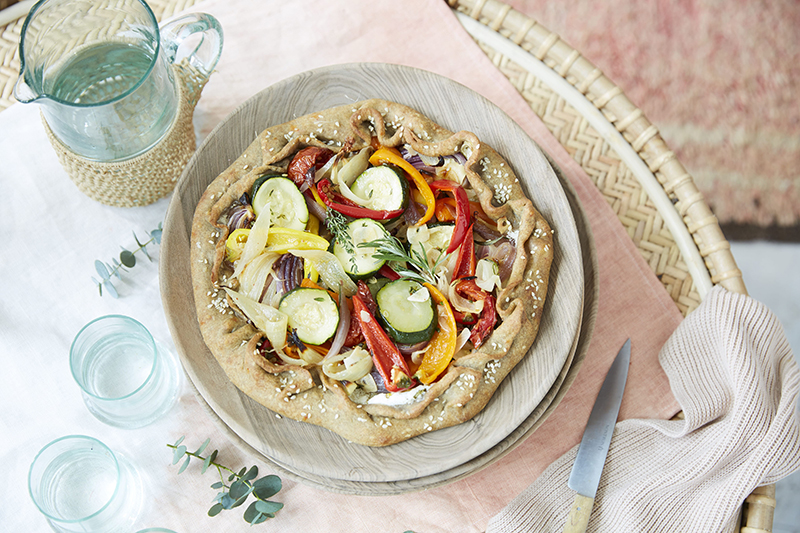 Sortez la pâte du congélateur et abaissez-la afin d’obtenir un diamètre d’environ 30 cm. Placez la pâte sur la toile de cuisson et répartissez l’appareil au centre avec la petite spatule coudée en laissant environ 2 cm de bord. Répartissez ensuite les légumes dessus puis rabattez les bords.