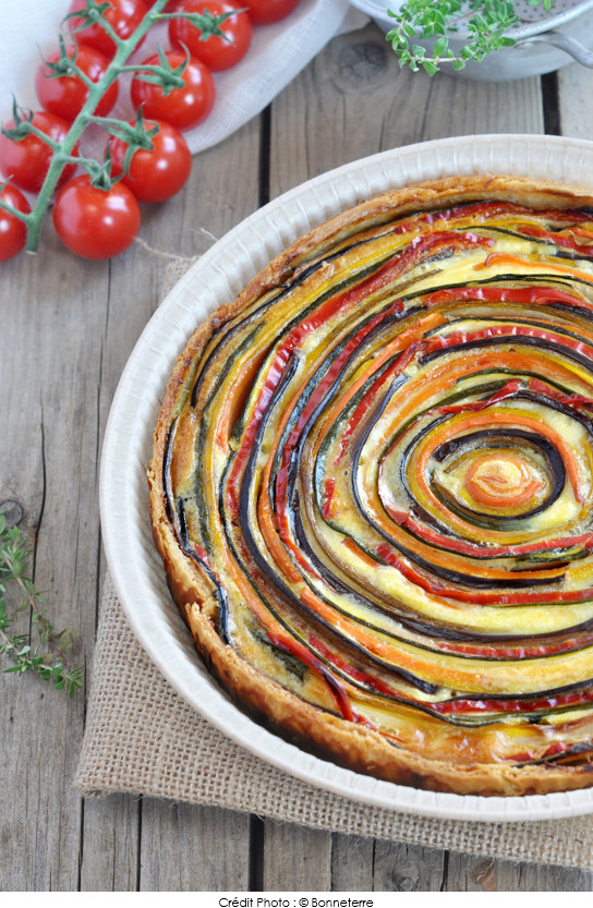 ⑧• Disposer les lamelles de légumes tout autour du bord du moule en les alternant pour jouer sur les couleurs, jusqu’à ce que le fond de tarte soit entièrement rempli.