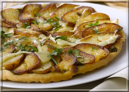 5.Découper le cantal en tranches fines et en parsemer la rosace de pommes de terre.