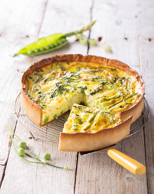 ④• Poser sur le fond de tartes les petits pois, les asperges coupées en 2 et les oignons nouveaux épluchés et coupés en 2 ou en 4 selon leur taille.
