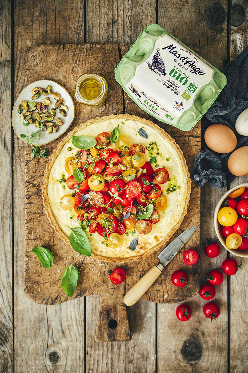 ⑧• Au moment de servir, coupez les tomates cerises en 2 ou en 4 selon leur taille et répartissez-les au centre de la tarte. Décorez de basilic frais, de pistaches concassées et arrosez le tout d’un filet d’huile d’olive.