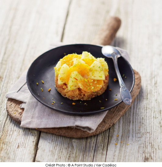 ②• Dans chaque assiette, à l’aide de l’emporte-pièce, reconstituer un fond de tarte avec la pâte de Palets Bretons. Réserver au frais.