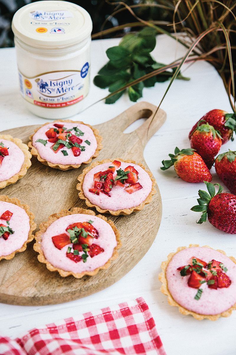 ④• Monter les blancs en neige. Dans un saladier mélanger le coulis de fraises et la crème fraîche Isigny Sainte-Mère au fouet. Ajouter doucement avec une maryse les blancs de neige à la préparation. Placer la mousse dans une poche à douille pour garnir les tartelettes et laisser reposer 1 heure au réfrigérateur.