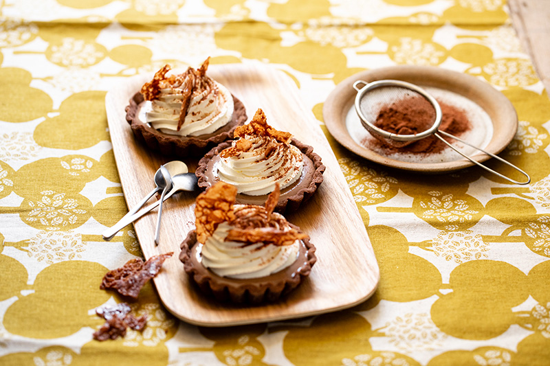 Avant de servir, décorer les tartelettes de chantilly à l’aide d’une poche à douille et de tuiles dentelle chocolat.