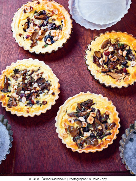 ⑥• Verser la préparation au céleri sur les fonds de tartelettes, ajouter les champignons, saupoudrer de noisettes concassées.