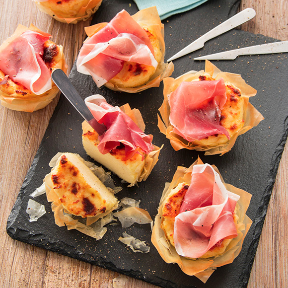 Tartelettes de pâte filo à la semoule, au fromage et au jambon de Parme
