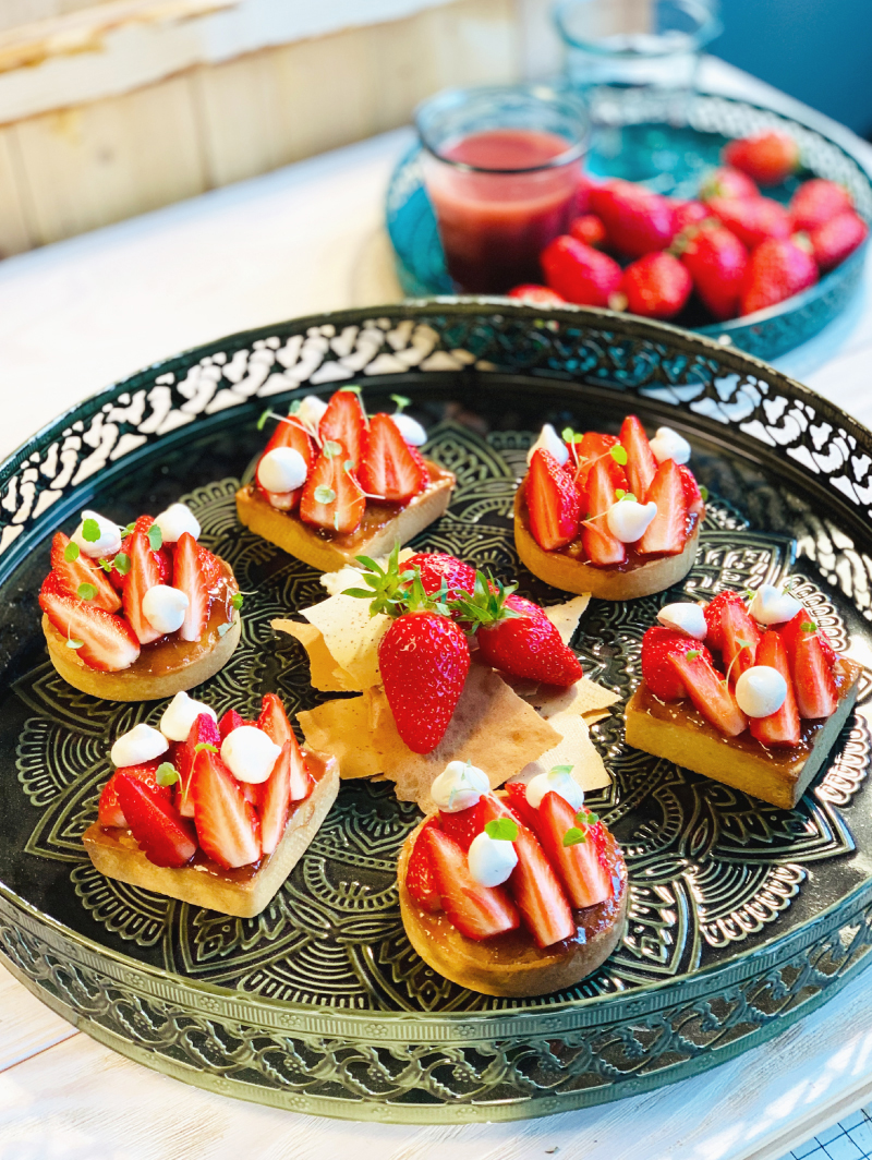 Garnir de fraises coupées en 4 et décorer avec des mini meringues.