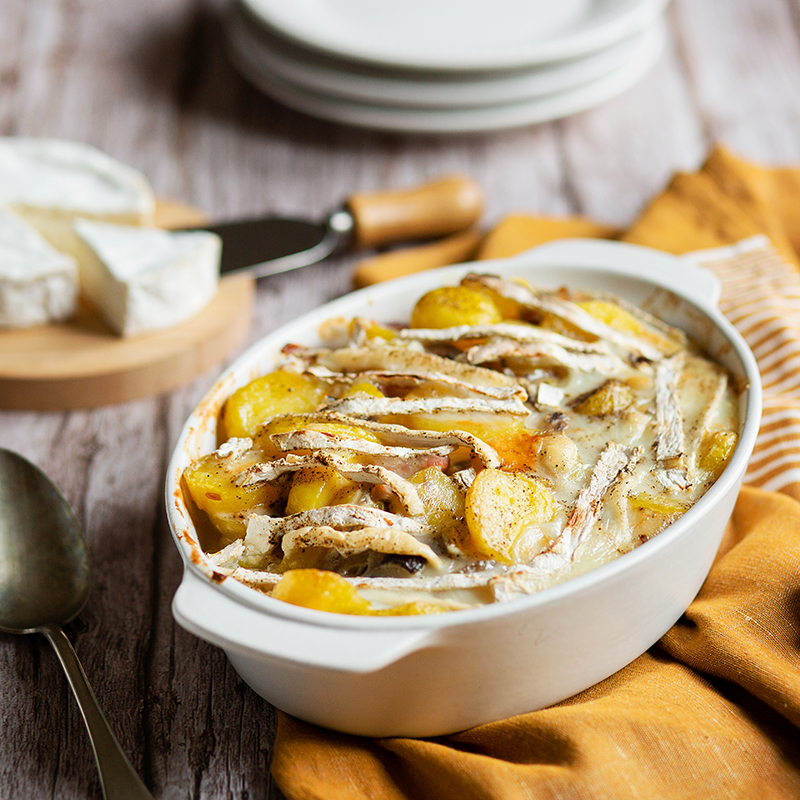 On n’y pense pas assez mais le chèvre-boîte se prête bien au jeu de la tartiflette. Il va se fondre entre les pommes de terre et sa croûte va gratiner en surface, pour une texture agréable, croustillante et un plat qui au final fait beaucoup de bien.