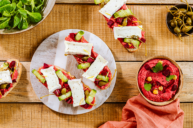 Tartine au houmous de betterave, concombre et Ovale de Chèvre