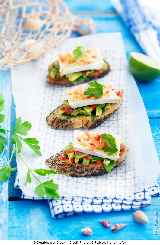 Répartir le mélange avocat et tomate sur les tranches de pain, disposer sur chaque préparation une tranche de Caprice des Dieux cœur de gamme. Déposer 1 c. à café de chair de crabe sur le fromage.