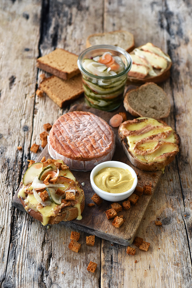 ⑦• Tartinez-les d'une fine couche de moutarde. Coupez l’Époisses AOP en tranches et posez-les sur les tartines.