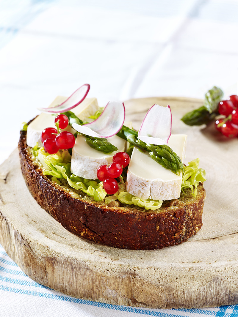 ⑤• Dressage : Sur les tranches de pain toastées, répartir la sucrine, le Reblochon, les radis, les asperges coupées en deux et les groseilles.