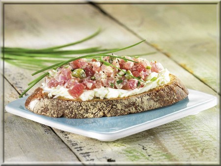 Étalez le reste du fromage Kiri® sur les tartines, recouvrez du tartare et donnez quelques tours de moulin à poivre avant de servir.