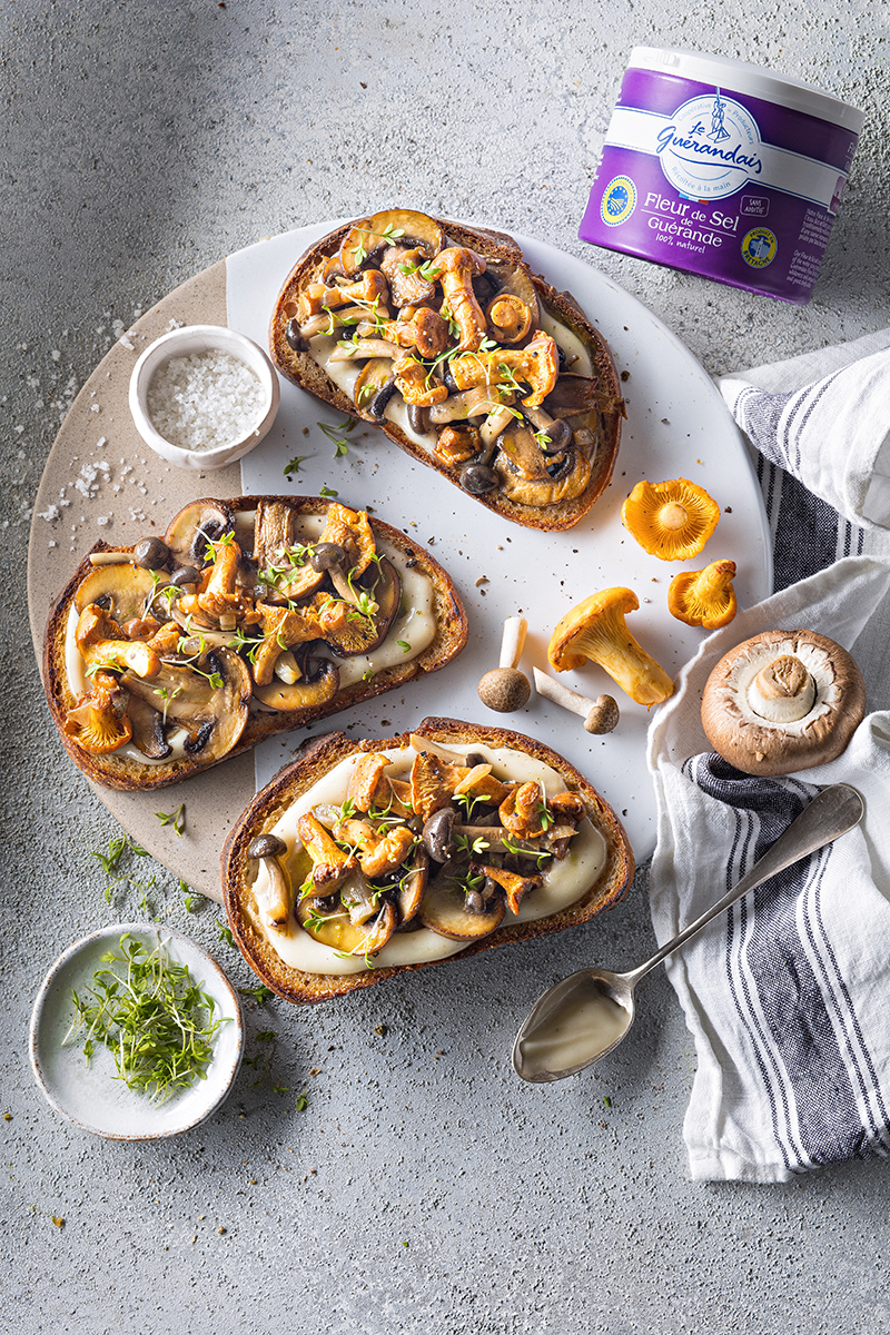 Tartines à la crème d’ail, champignons sautés, huile de persil et Fleur de Sel Le Guérandais
