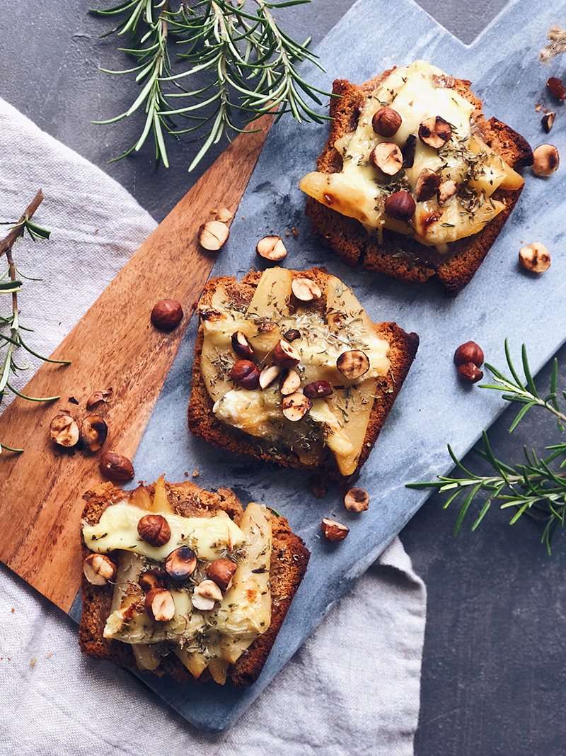 Tartines de pain d’épices, poires, Rocamadour et noisettes grillées