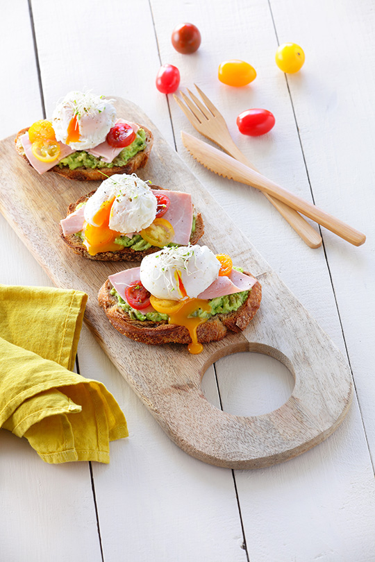 ③• Toastez les 4 tranches de pain de campagne puis tartinez-les d’écrasé d’avocat. Découpez le jambon en bandes et déposez-le sur le pain. Ajoutez ensuite quelques morceaux de tomates cerise coupées en deux puis les œufs.