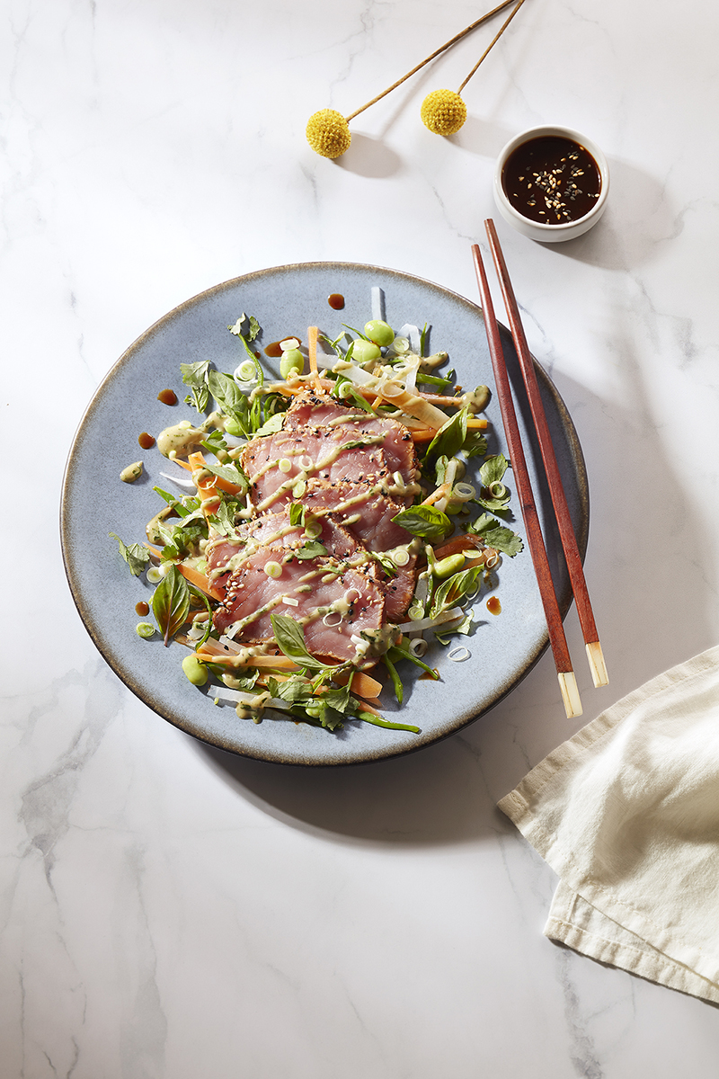 ⑤• Dressage. Dresser de façon “salade méli-mélo”, les carottes et les daikons. Ajouter les pois gourmands, puis venir déposer des fines tranches de veau tataki par-dessus. Comme une salade, venir ensuite dresser avec les feuilles de coriandre et basilic, tiges de cébettes, et les edamames. Ajouter la sauce thaï tonnato puis des traits de sauce de la marinade.