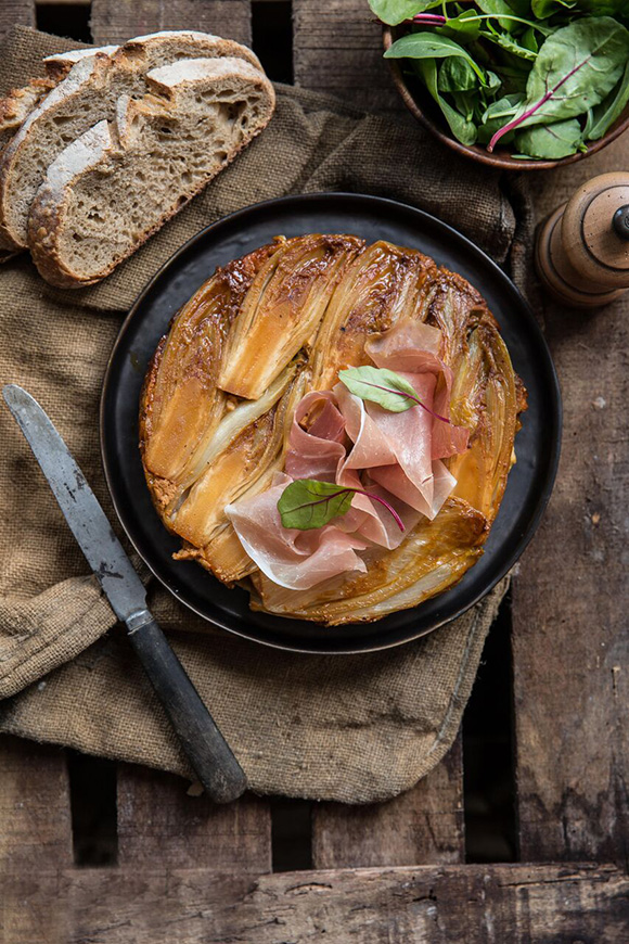 Démouler la tatin d’endive et disposer élégamment le jambon cru au centre.