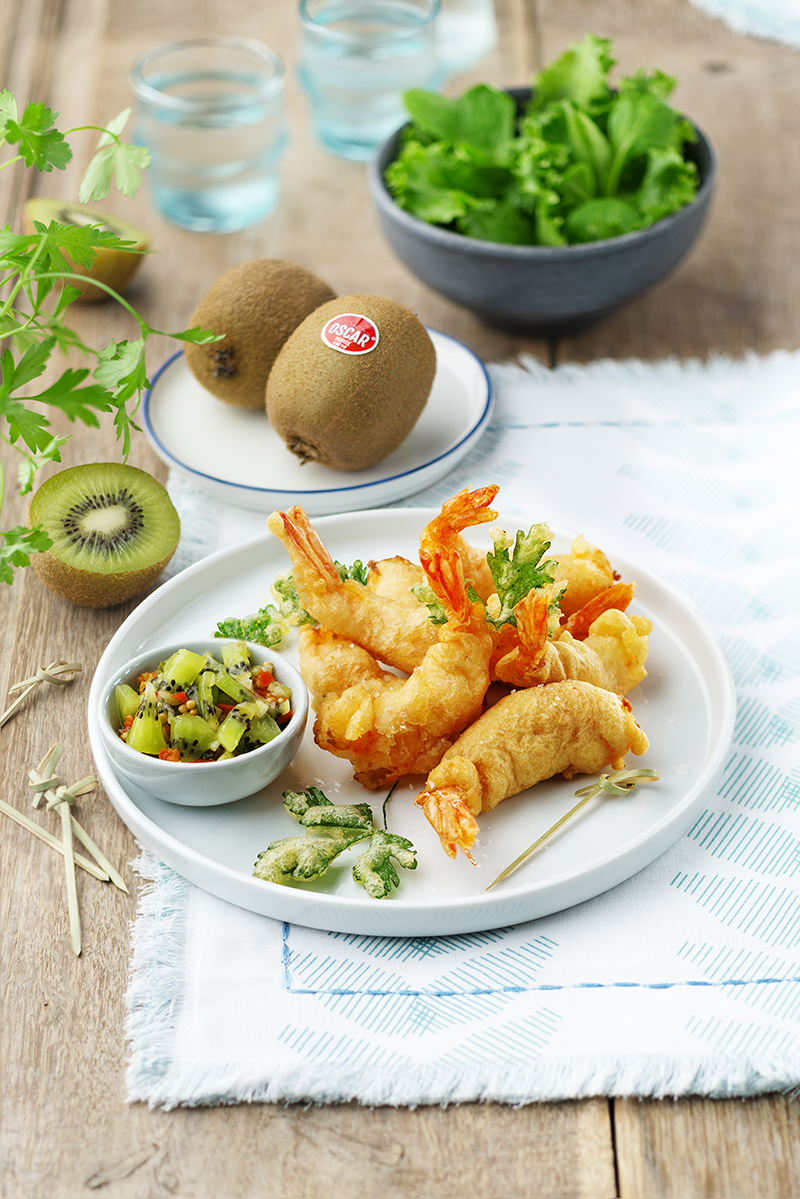 ⑩• Tenir les gambas par la queue. Les enrober dans la pâte à tempura. Plonger les gambas deux par deux dans l’huile de friture. Les faire tourner dans l’huile à l’aide d’une fourchette. Cuire 1 minute. Disposer les gambas cuites sur un papier absorbant.