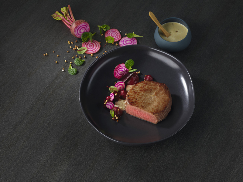 Tendre de bœuf flambé au whisky, betterave, sauce whisky sarrasin