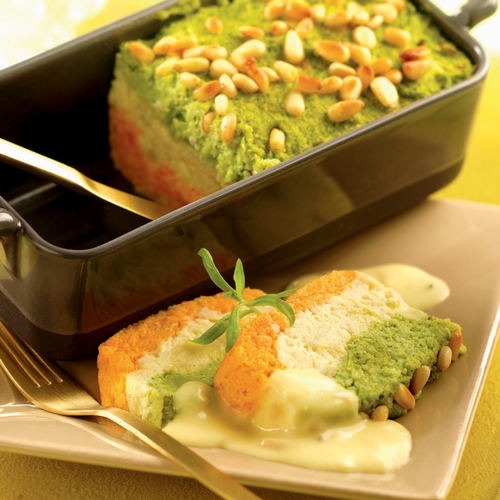 6.Dans un moule à cake, tapissez en couches successives les purées. Finissez en saupoudrant de pignons de pin en sachet ou graine gourmandes TIPIAK
