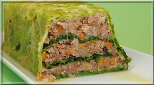 Badigeonner un terrine de 28 cm de long ( 2 l de volume environ ) de graisse de canard. Tapisser les parois avec 6 feuilles de chou ( les feuilles doivent dépasser de la terrine ) et le fond avec 2 feuilles coupées en 2.