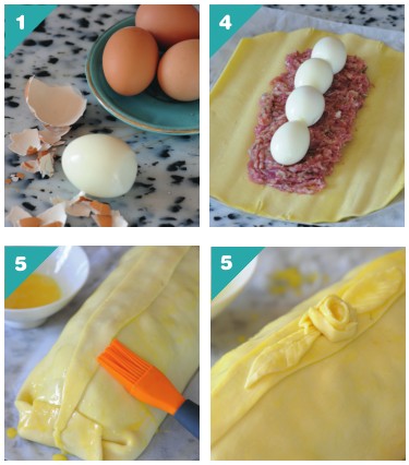 4• Étale la pâte brisée sur une feuille de papier sulfurisé. Badigeonne-la de moutarde à l’aide d’une spatule. Dispose un rectangle de farce d’environ 20 à 25 cm sur la pâte puis place les œufs durs entiers à intervalles réguliers. Recouvre les œufs avec la farce restante en comblant bien les vides.