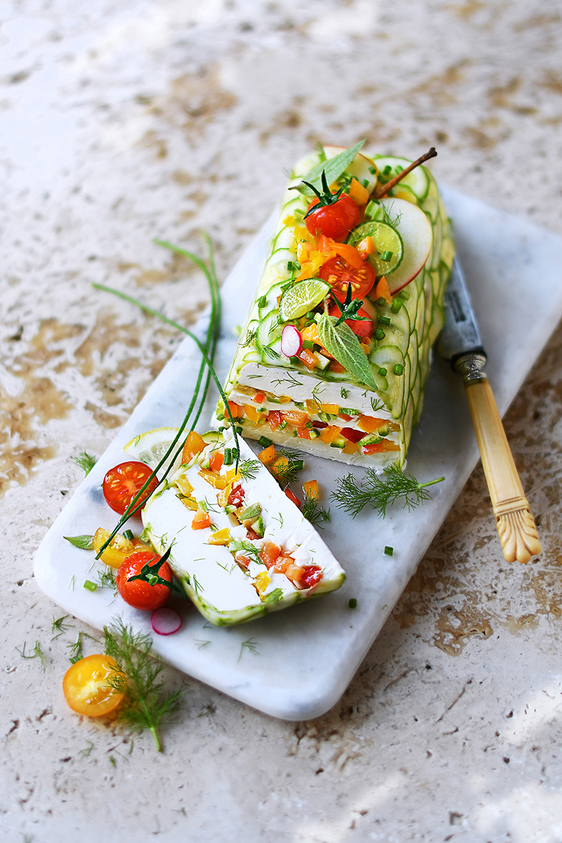①• À l’aide d’une mandoline, taillez le concombre Noa en rondelles très fines. Chemiser une terrine avec du film étirable et tapisser le fond du moule avec les rondelles en les faisant se chevaucher à la manière des écailles de poisson.