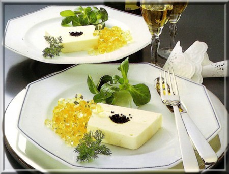 Répartir œufs de lump et gelée. Décorer d'aneth et de mâche.