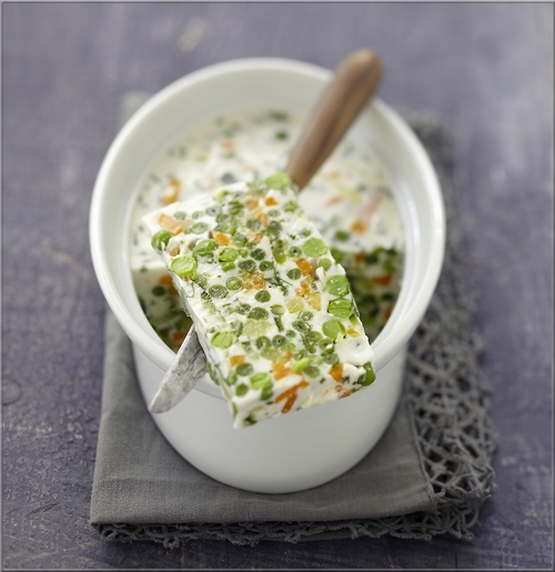 5• Dans une terrine, disposez une fine couche de préparation au carré frais. Ajoutez une couche de courgettes puis recouvrez de carré frais. Continuez à monter la terrine avec les autres légumes en terminant par le carré frais.