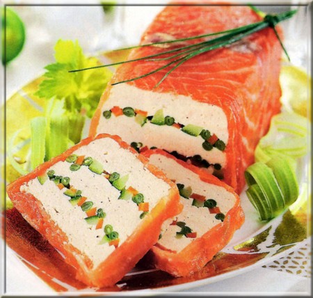 3-Alterner dans le moule des couches de préparation au saumon et de légumes,puis rabattre les tranches de saumon dessus.Réfrigérer 12h.