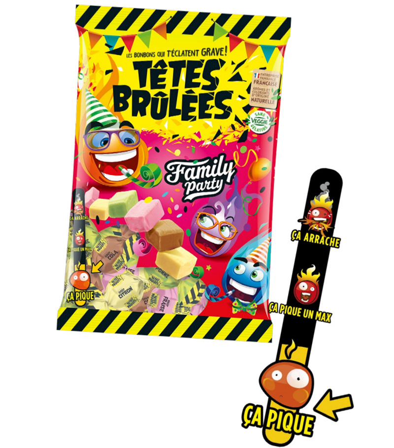 Pour l’occasion, la marque lance en effet ses premiers bonbons tendres, façon pâte à mâcher ! Elle a réuni et emballé individuellement ses nouveautés dans un sachet événementiel ultra-coloré : « FAMILY PARTY ». L’acidité des nouveaux bonbons au citron, à la fraise, au cola et à la pomme se situe au 1er degré de l’échelle d’intensité des Têtes Brûlées. Ils offrent ainsi un piquant suffisamment raisonnable pour plaire aussi bien aux parents qu’aux enfants !