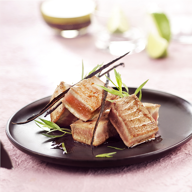 ⑤• Découper le thon en carrés, déposer en assiettes, napper de marinade.