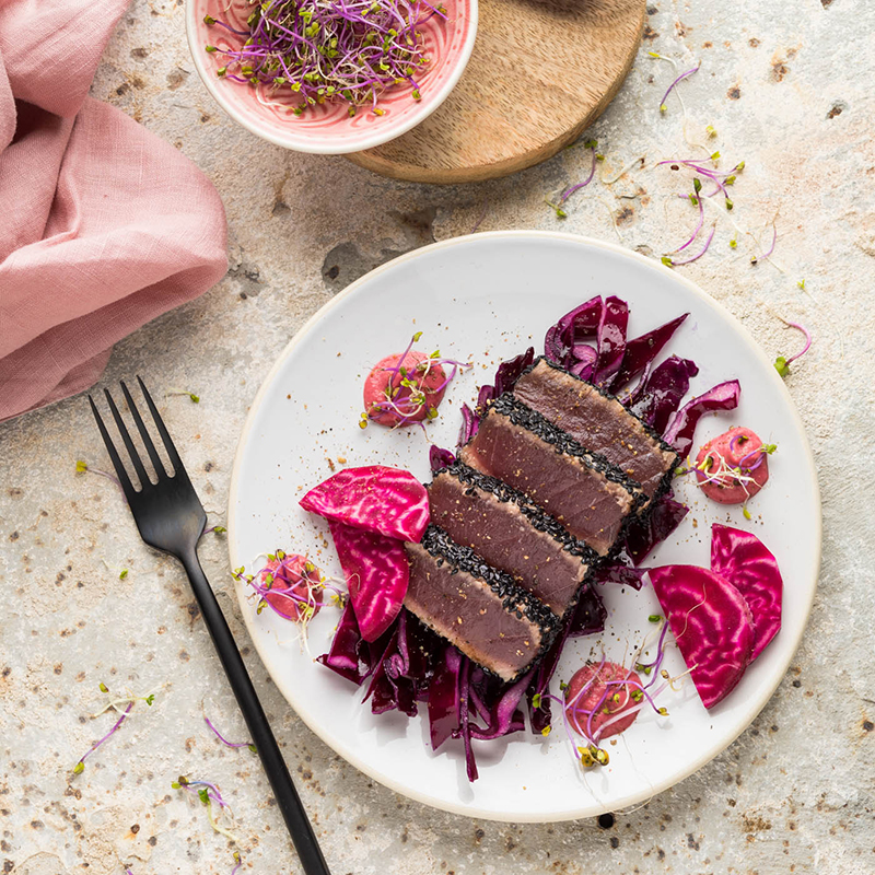 Thon rouge snacké au sésame noir, salade de chou rouge et houmous de betterave