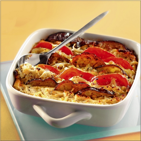 5• Dans un plat à gratin légèrement huilé, alterner des couches de tomates, d'aubergines, et d'oignons au fromage.