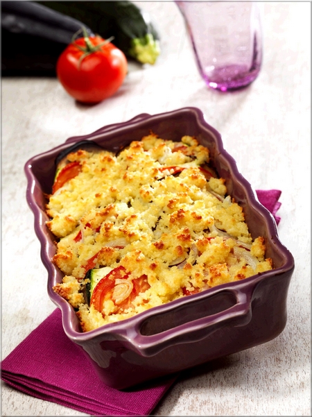 7• Mettez le crumble sur le tian de légumes et enfournez à 180°C pendant une dizaine de minutes, histoire de faire colorer et dorer le plat.