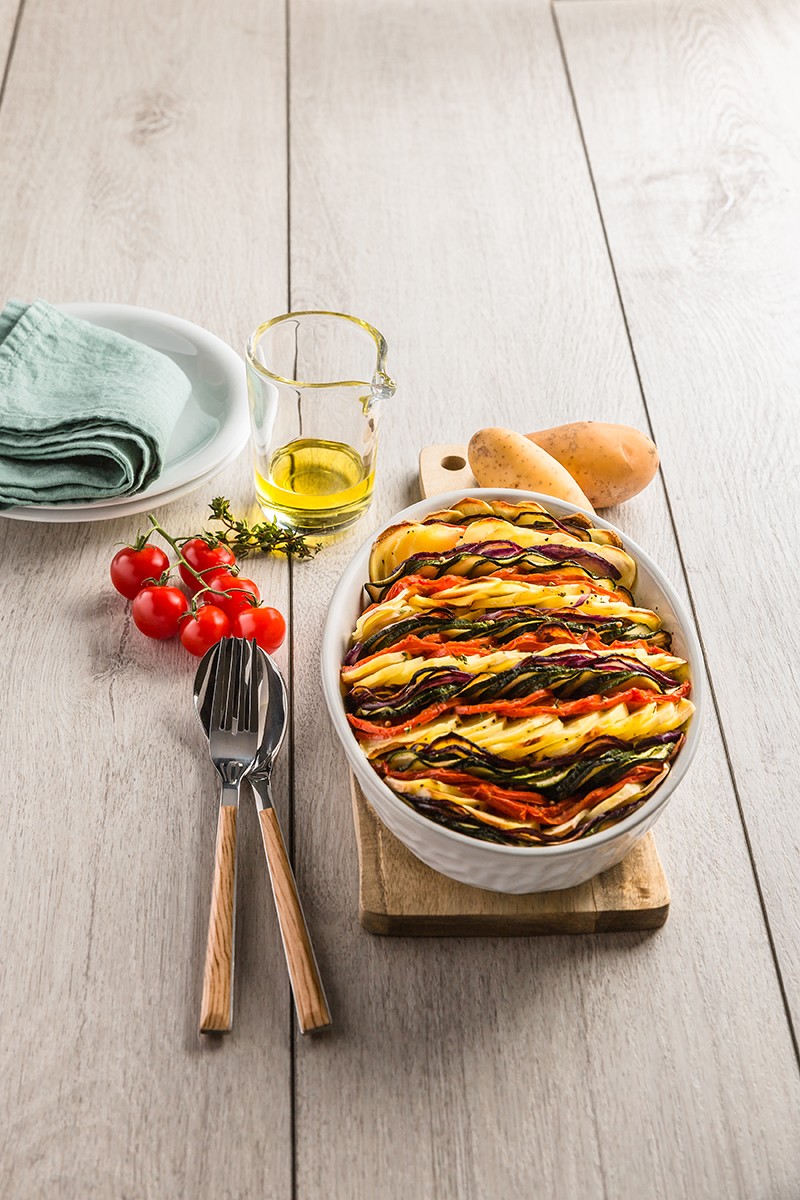 ③• LAVEZ les légumes et les Pompadour Label Rouge puis coupez-les en rondelles de même épaisseur à la mandoline. Disposez-les dans un plat en alternant les tranches. Parsemez d'ail haché, salez, poivrez. Arrosez d'huile d'olive et saupoudrez d'herbes fraîches ciselées et de graines de moutarde.
