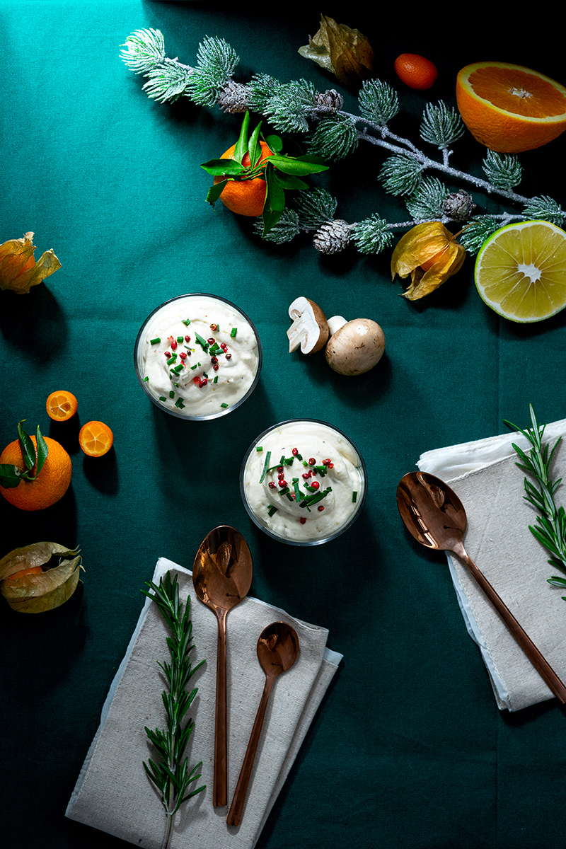 Dans une poêle, faites revenir les champignons dans une noix de beurre. Ajoutez de la ciboulette, salez et poivrez. Laissez refroidir avant le montage.
