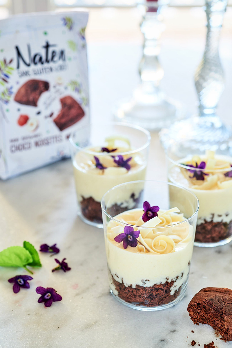 Décorez de copeaux de chocolat blanc juste avant de servir.