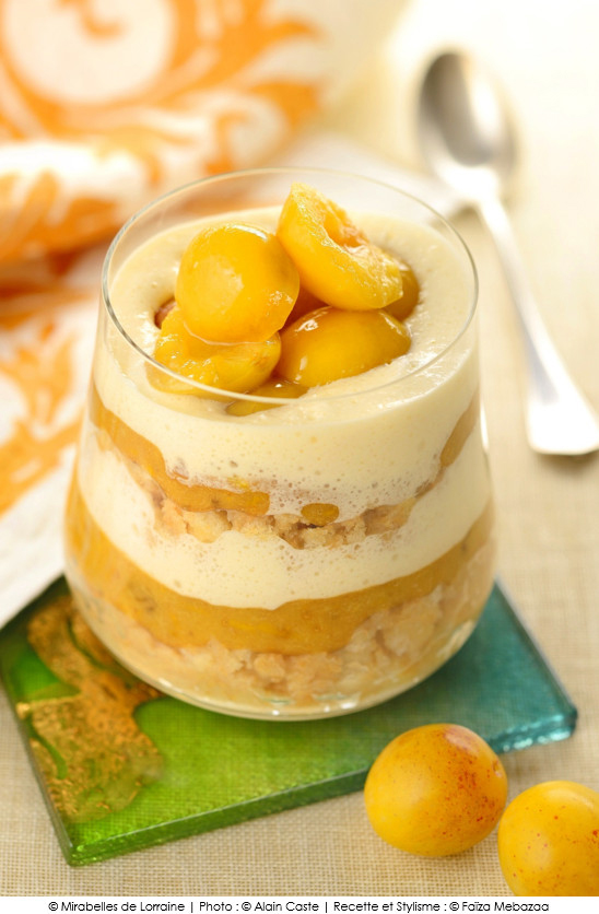 Astuce : Si vous souhaitez avoir une présentation en couches bien délimitées, concassez les biscuits et mixez les Mirabelles de Lorraine en en réservant quelques-unes pour le décor.