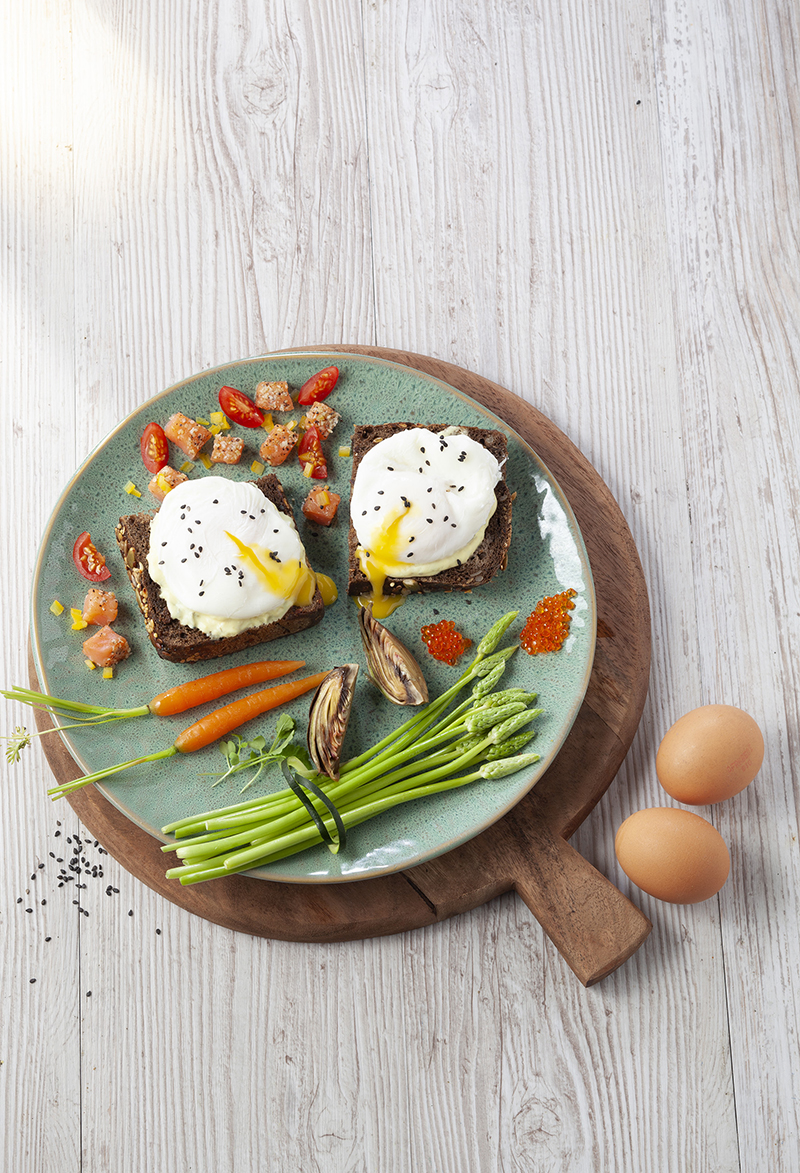 Toasts aux œufs pochés, sauce hollandaise et petits légumes