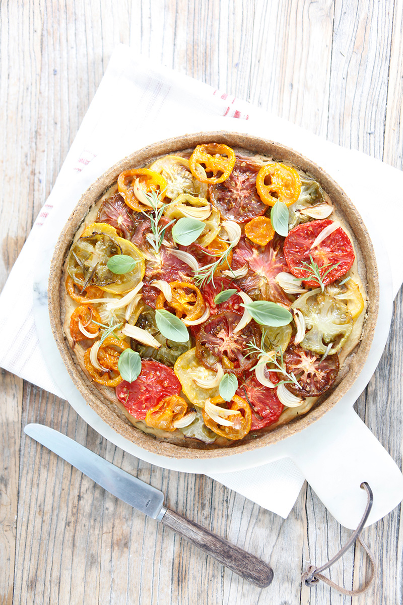Décorer la tarte de feuilles de basilic avant de la déguster bien chaude ou simplement tiède, accompagnée d’une salade de jeunes pousses.