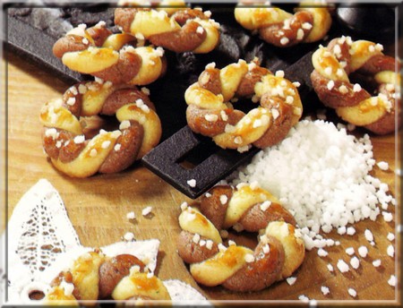 3.Les rouler sur un plan de travail fariné, en 2 longs boudins d'1/2 cm de diamètre. Les couper en tronçons de 8 cm. Torsader 2 tronçons différents et souder les 2 bouts au lait. Enduire chaque torsade bicolore de lait et la poser sur la plaque du four beurrée.