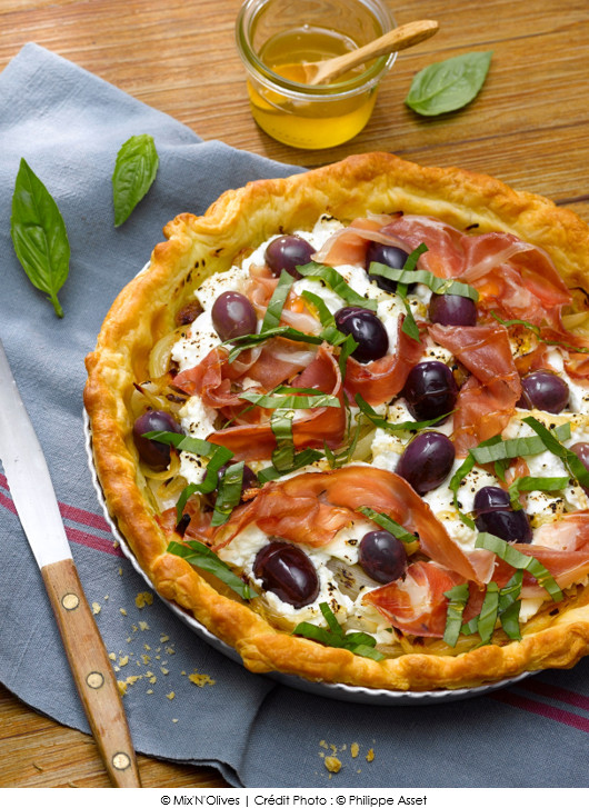 Torta d’olives violettes, chèvre frais et jambon Serrano