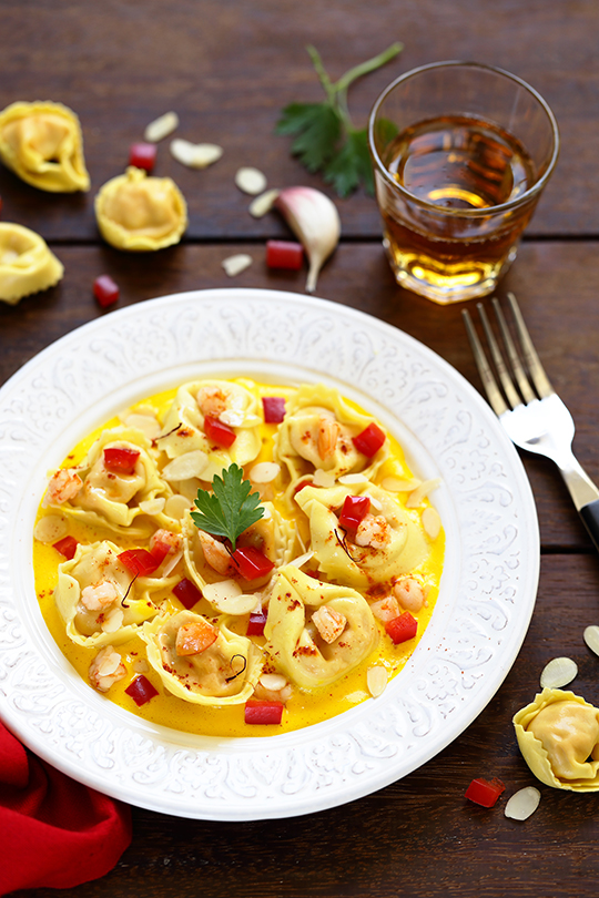 ⑤• Égouttez les Tortellini à l’aide d’une écumoire et posez-les dans l’assiette sur la sauce. Garnissez avec les crevettes, les dés de poivron, les amandes puis versez un filet d’huile. Ajoutez le paprika et une feuille de persil plat.