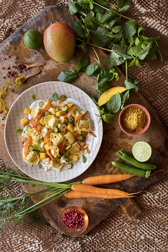 Les tortellini Inde sont ici relevés sur un lit de lait de coco, des petits légumes sautés et des dés de mangue pour une touche sucré-salé