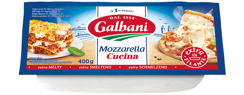 La Mozzarella Galbani Cucina est spécialement adaptée pour la cuisson. Elle est conditionnée sous vide sans saumure. Son faible pourcentage d’humidité lui confère un fondant unique. Elle se prête tout particulièrement à la préparation des pizzas et des plats gratinés.
