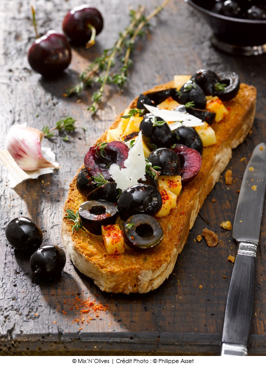 Tostada de pain de campagne, mix d’olives noires et cerises